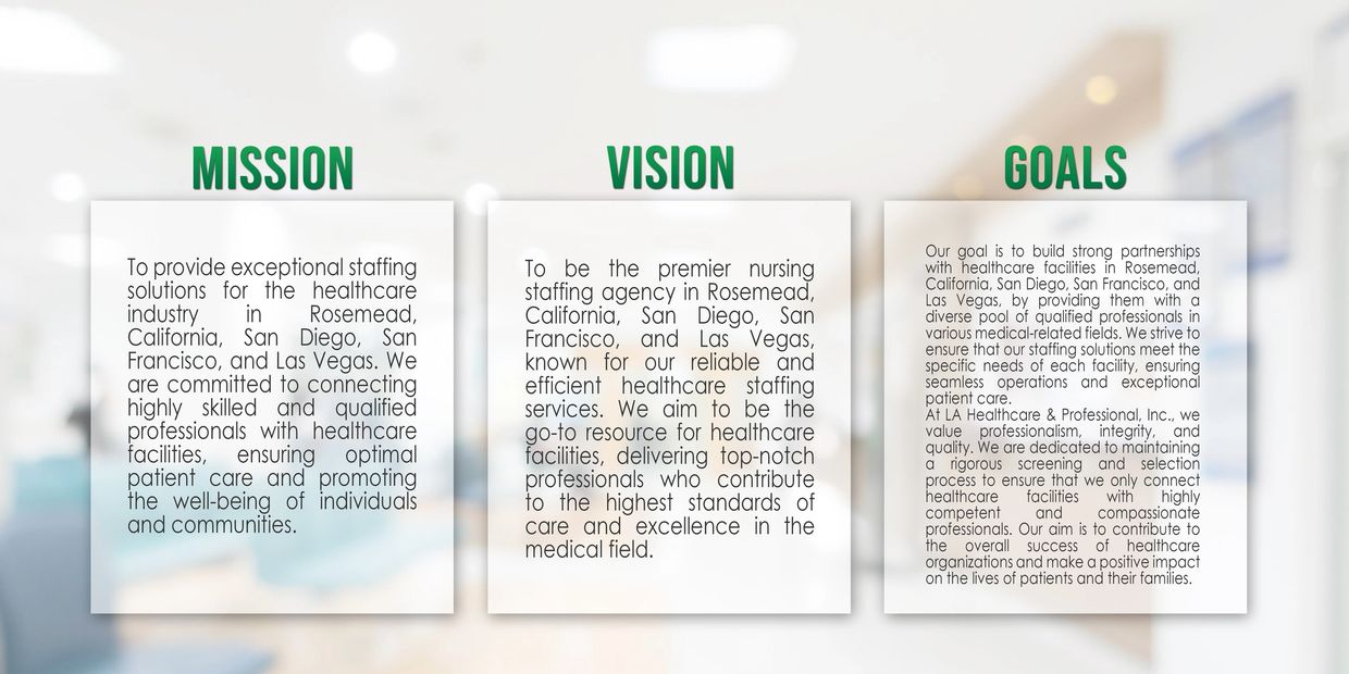 At LA Healthcare & Professional, Inc., we are committed to excellence in everything we do. We understand the importance of providing high-quality healthcare services, and that starts with the professionals we connect you with. We continuously monitor and evaluate our placements to ensure that they meet and exceed your expectations.